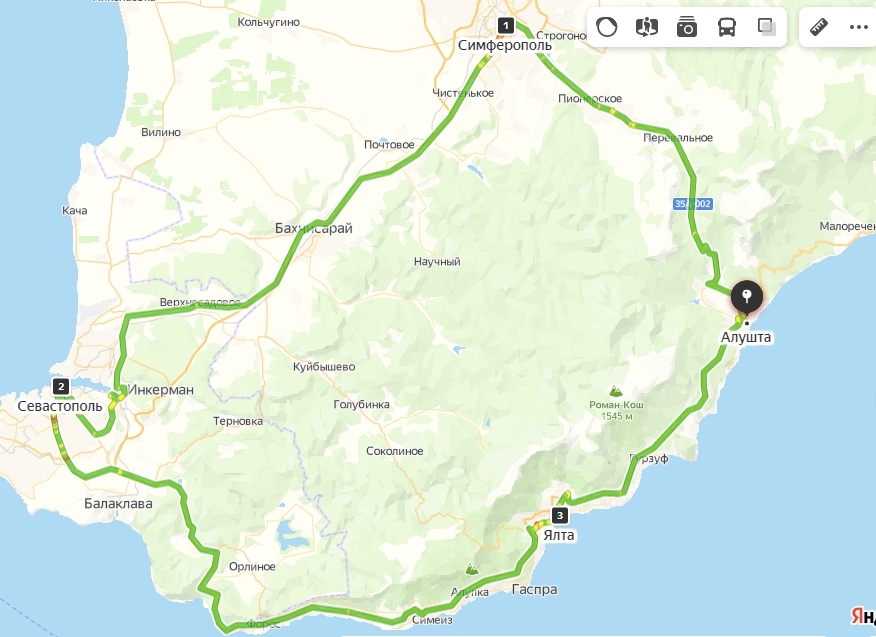 - Маршрут по Крыму из Алушты в Севастополь через Симферополь, Бахчисарай и обратно через Ялту