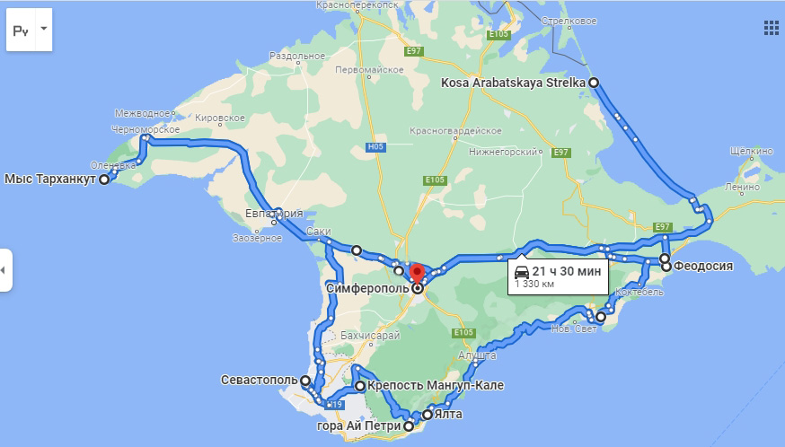 - Маршрут по Крыму из Феодосии через Арабатскую стрелку, потом обратно через Ялту в крепость Мангул-Кале, Севастополь, Евпаторию, мыс Тарханкут